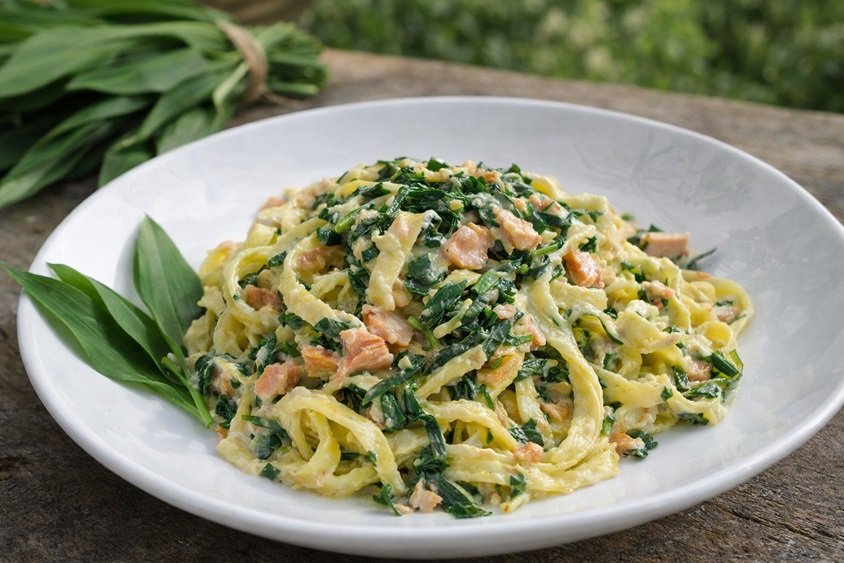 Die Bärlauch-Tagliatelle mit Lachs nach einer selbstgemachten Bärlauchsuppe servieren. Dieses Gericht ist für begeisterte Bärlauch Liebhaber!