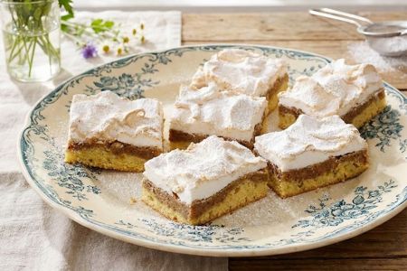 Die Baiser-Nuss-Schniten vor dem Servieren mit Staubzucker betäuben.