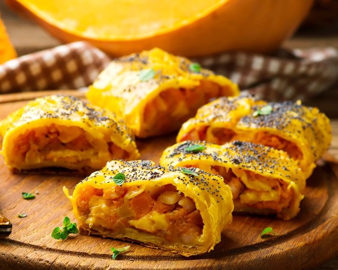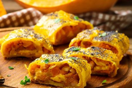 - Die Kürbismasse in eine Schüssel geben, Sauerrahm und kleine Semmelwürfel unterrühren und alles gut vermischen. Den Blätterteig ausrollen und auf ein sauberes Geschirrtuch legen. Die Kürbisfüllung auf dem unteren Drittel gleichmäßig verteilen. Das obere Teigdrittel mit verquirltem Ei bestreichen und den Teig mithilfe des Tuchs zu einem Strudel aufrollen. Mit dem restlichen Ei bestreichen. Den Kürbisstrudel auf das Backblech legen, mehrmals mit einer Gabel einstechen, mit Sesam, andere Samen oder gehackte Kürbiskerne bestreuen und im Ofen zunächst 15–20 Minuten bei 220 °C backen. Dann die Temperatur auf 180 °C reduzieren und zirka weitere 20 Minuten goldbraun fertig backen.
