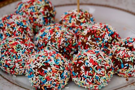 - Danach mit den Händen kleine Kugeln formen und diese großzügig in bunten Zuckerstreuseln wälzen. Die fertigen, bunten Schokokugeln für etwa eine Stunde im Kühlschrank fest werden lassen – danach sind sie bereit zum Servieren.