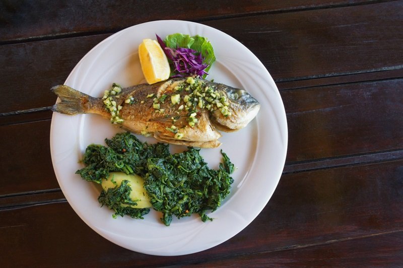 - In einer großen Pfanne mit Olivenöl die Doraden von beiden Seiten je zirka 5 Minuten goldbraun braten, bis die Haut knusprig und das Fleisch saftig ist. Die gebratene Dorade auf dem Mangold-Kartoffel-Gemüse anrichten und sofort heiß genießen.
