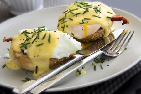 - Je eine Scheibe Speck auf das geröstetete Gebäck legen. Ein pochiertes Ei darauf setzen und großzügig mit Sauce Hollandaise überziehen. Mit Salz, Pfeffer würzen und frisch gehacktem Schnittlauch verfeinern.