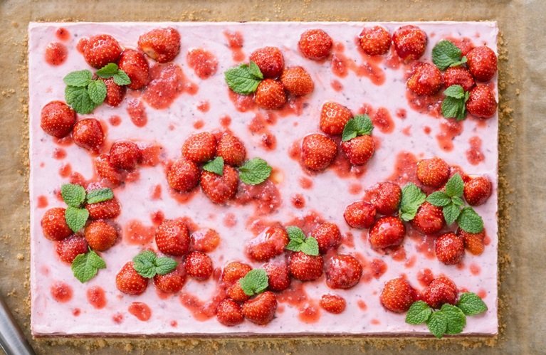 - Vor dem Servieren das restliche Erdbeerpüree dekorativ auf den Kuchen geben und mit frischen Erdbeeren und Zitronenmelisse garnieren.