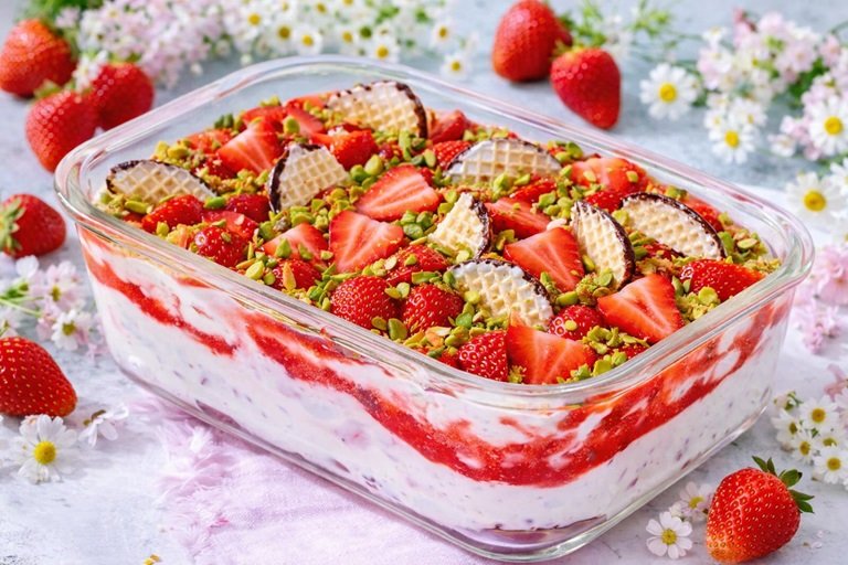 - Zirka 6 Waffelböden in eine rechteckige Form legen. Darauf die Dessert-Creme verteilen, Erdbeerpüree darüber gießen und mit einem Löffel leicht unterheben. Abschließend mit geschnittenen Erdbeeren bedecken. Die restlichen Waffelböden grob zerbrechen und als Topping auf das Dessert geben und mit gehackten Pistazien bestreuen.