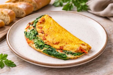 - Die Eimasse in die Pfanne geben und bei mittlerer Hitze langsam stocken lassen. Speckwürfel, Paprika, frischen Spinat und Käse gleichmäßig darauf verteilen. Die Pfanne mit einem Deckel schließen und das Omelett etwa 3 Minuten weitergaren, bis es gestockt ist. Den Deckel entfernen, das Omelett vorsichtig zusammenklappen und noch etwa 30 Sekunden weiter braten. Anschließend auf einen Teller gleiten lassen und sofort servieren.