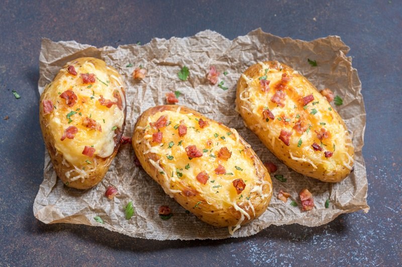- Die Kartoffeln etwas abkühlen lassen, längs halbieren und mit einem Löffel vorsichtig aushöhlen. Das herausgenommene Kartoffelinnere in eine Schüssel geben. Speck und Frühlingszwiebeln klein schneiden und in einer Pfanne scharf anbraten. Zusammen mit dem Frischkäse zum Kartoffelinneren geben und gut vermengen. Mit Salz und Pfeffer abschmecken. Die Kartoffelhälften mit der Masse füllen und mit geriebenem Käse bestreuen.