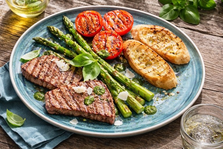 - Tomatenscheiben mit der Schnittfläche nach auf den Grill legen und 8–10 Minuten grillen, dabei einmal wenden und mit Salz und Pfeffer würzen. Nach etwa der Hälfte der Zeit Steaks und Spargel auf den Grill legen. Alles zusammen zirka 5 Minuten grillen, einmal wenden. In den letzten 2 Minuten die Baguette-Scheiben auf dem Grill von beiden Seiten knusprig rösten. Die gegrillten Minutensteaks mit Spargel, Tomaten und knusprigem Brot auf Tellern anrichten. Mit etwas Pesto beträufeln, nach Wunsch mit frischen Basilikumblättern garnieren und mit Parmesanspänen bestreuen.