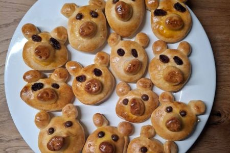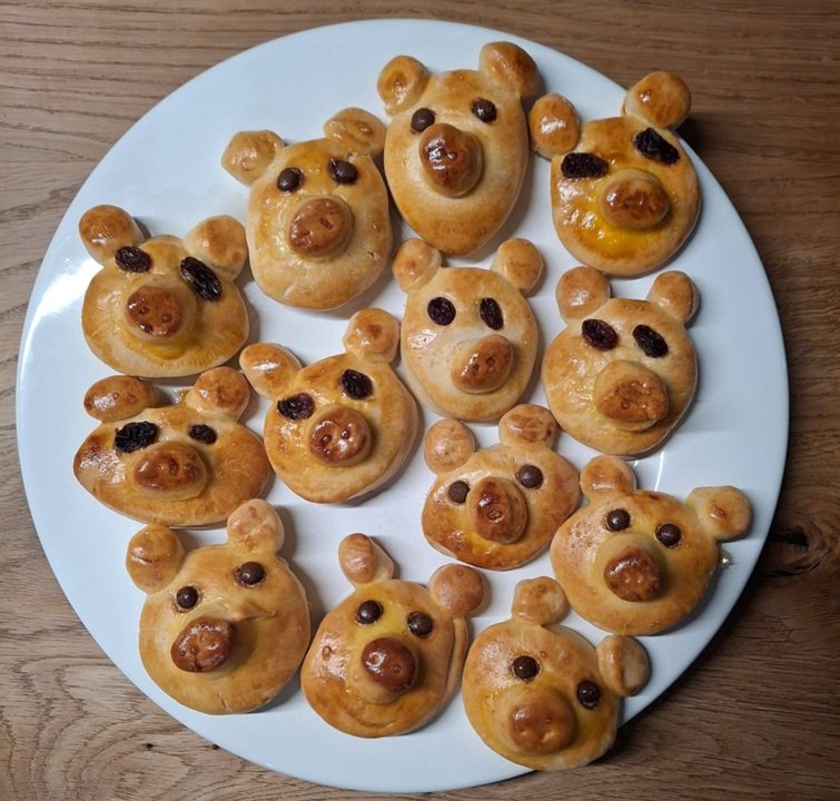 - Die großen Teigkreise auf ein mit Backpapier belegtes Blech legen, die Schnauzen mittig aufsetzen. Aus dem restlichen Teig kleine Dreiecke für die Ohren formen und seitlich anbringen. Für die Augen jeweils zwei Rosinen leicht in den Teig drücken. Zum Schluss die Germteig-Glücksschweinchen mit verquirltem Ei bestreichen und im vorgeheizten Backofen bei 170 °C Ober-/Unterhitze etwa 20 Minuten goldbraun backen.