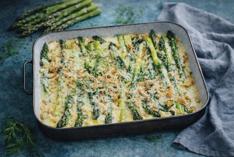 Grünes Spargelgratin passt hervorragend zu Fleisch, Fisch oder kann auch als vegetarisches Hauptgericht serviert werden.