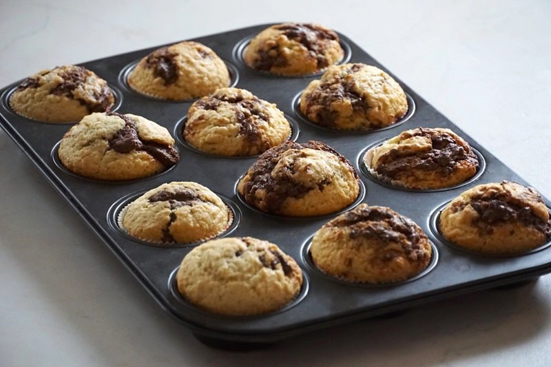 - Nun den Teig gleichmäßig auf 12 Muffinförmchen verteilen. In jedes Förmchen einen gehäuften Teelöffel Haselnusscreme (z. B. Nutella) geben und mit einem Zahnstocher leicht unterziehen, um eine feine Marmorierung zu erhalten. Die Haselnusscreme-Muffins 18–20 Minuten goldgelb backen, kurz abkühlen lassen und aus der Form nehmen. Am besten noch leicht warm servieren – dann ist die Haselnusscreme wunderbar zartschmelzend!