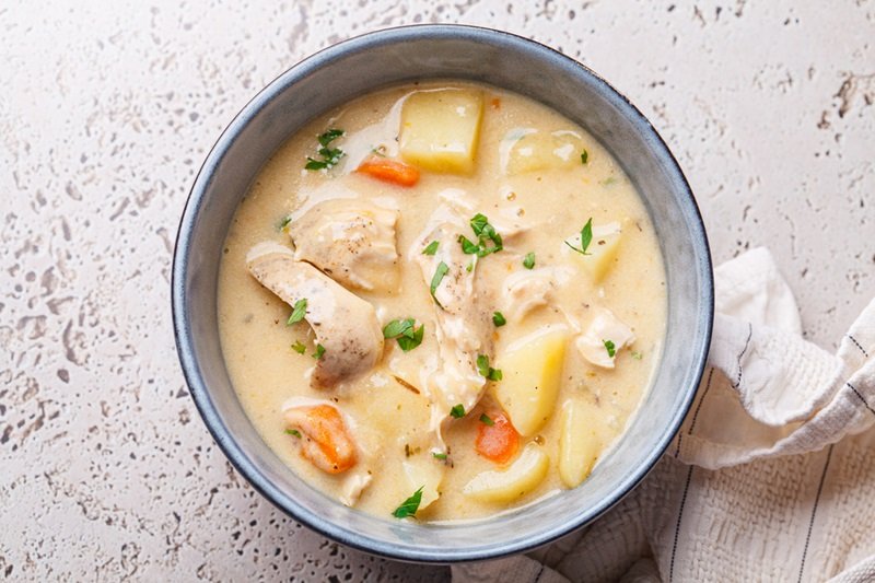 - Jetzt die angebratenen Hähnchenwürfel zurück in den Topf geben und den Eintopf weitere 10 Minuten sanft garen. Zum Schluss das Schlagobers unterrühren, sodass eine cremige Sauce entsteht. Den Hühncheneintopf mit cremiger Sauce mit Salz, Pfeffer und frisch geriebener Muskatnuss abschmecken und heiß servieren