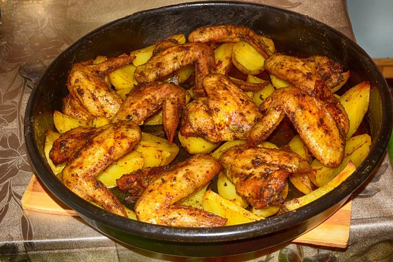 - Den Backofen rechtzeitig auf 170 °C Ober-/Unterhitze vorheizen. Die marinierten Hühnerflügel zusammen mit den Kartoffelspalten in eine ofenfeste Form geben. Im vorgeheizten Ofen etwa 35–40 Minuten backen, bis die Hühnerflügel knusprig und die Kartoffeln goldbraun sind.
