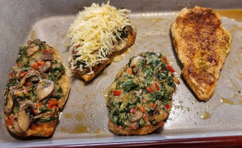- In derselben Pfanne erneut etwas Olivenöl erhitzen. Die in Scheiben geschnittenen Champignons anbraten. Fein gehackte Zwiebel und gewürfelte Paprika hinzufügen und einige Minuten mitdünsten. Den Knoblauch kurz mit anrösten. Den Spinat dazugeben und zusammenfallen lassen. Mit Salz, Pfeffer und einer Prise Muskat würzen. Mit Mehl bestäuben, kurz anschwitzen und anschließend mit Vollmilch aufgießen. Die Sauce unter Rühren cremig einkochen lassen.