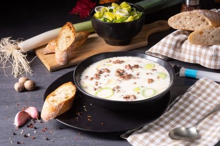 Die Käse-Lauch-Suppe eignet sich hervorragend zum Vorbereiten und Wiederaufwärmen. Zur Suppen ein Baugette oder eine Scheibe Vollkornbrot reichen.