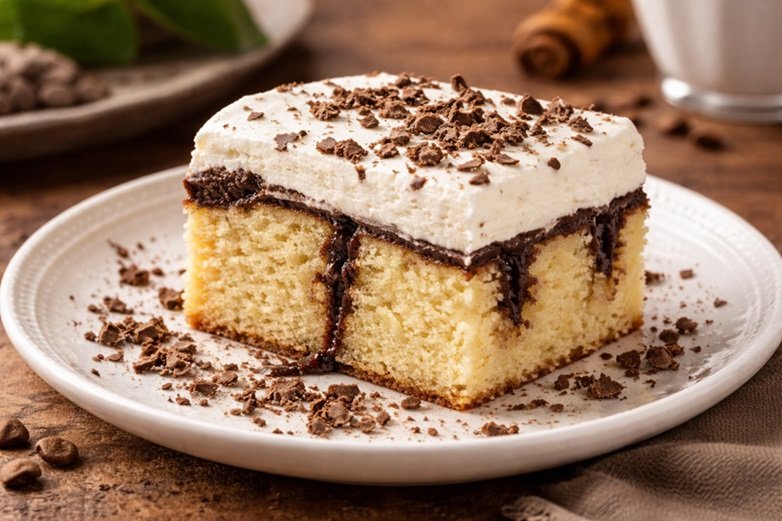 - In der Zwischenzeit mit dem Stiel eines Kochlöffels gleichmäßig Löcher in den abgekühlten Kuchen stechen. Den leicht angedickten Kaffee zuerst in die Löcher füllen, danach den restlichen Guss vorsichtig über die gesamte Oberfläche verteilen. Den Kuchen nochmals für etwa 60 Minuten kaltstellen, damit der Kaffeeguss fest wird.