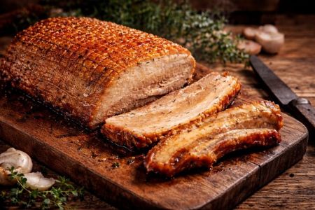 - Das Schweinefleisch rundum kräftig mit Salz, Pfeffer, Majoran, Kümmel und zerdrücktem Knoblauch einreiben. Butterschmalz oder Öl im Bräter erhitzen und den Braten zuerst auf der Schwartenseite anbraten. Danach wenden und im vorgeheizten Backrohr auf der mittleren Schiene (am besten auf dem Gitterrost) etwa 75-90 Minuten braten.
