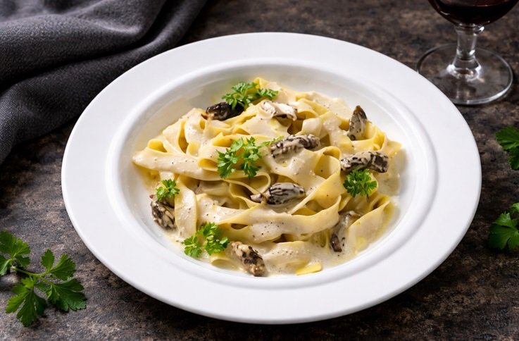- Die Nudeln zur Sauce in die Pfanne geben und gut vermengen. Die Nudeln mit Morchelsauce auf vorgewärmten Tellern anrichten und nach Belieben mit frischen Kräutern oder etwas Parmesan verfeinern.