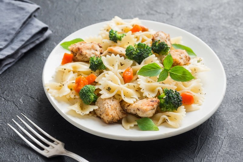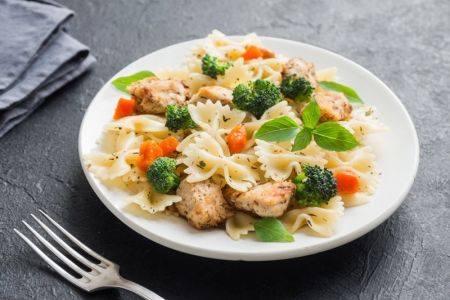 - Nudeln, Gemüse und Hühnchen in eine große Salatschüssel geben. Die Vinaigrette darüber verteilen und alles sorgfältig vermengen, sodass sich das Dressing gleichmäßig verteilt. Den Nudelsalat mit Hühnchen mindestens 30 Minuten im Kühlschrank durchziehen lassen, damit sich die Aromen optimal verbinden.