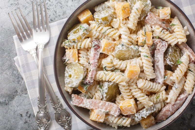 - Den Käse, Kochschinken und Essiggurken in gleichmäßige Würfel schneiden. Zusammen mit den abgekühlten Nudeln in eine große Schüssel geben. Alle Zutaten für das Dressing in einer separaten Schüssel glatt verrühren. Mit Salz, Pfeffer und einer Prise Zucker abschmecken. Wer es etwas frischer mag, kann zusätzlich einen Sprizter Zitronensaft einrühren. Das Joghurtdressing über die Salatzutaten geben und sorgfältig vermengen, sodass alles gleichmäßig bedeckt ist.