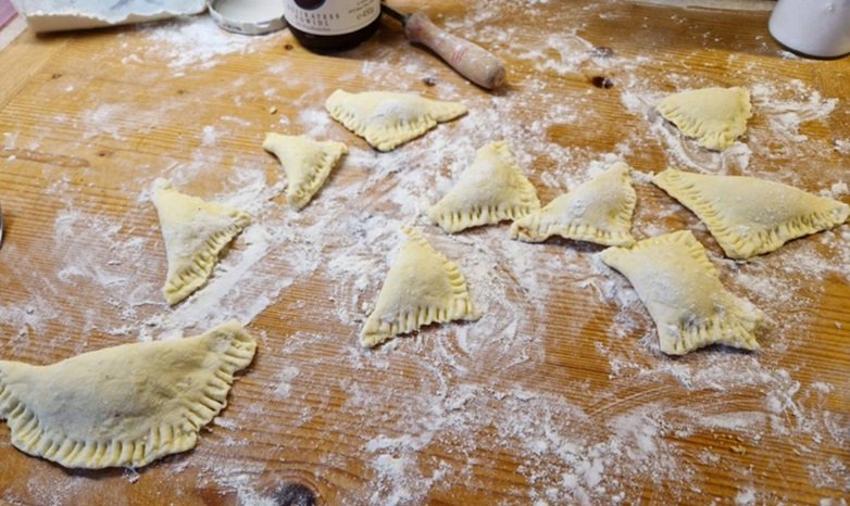 - Den Erdäpfelteig auf einer gut bemehlten Arbeitsfläche zirka 3 mm dünn ausrollen. Mit einem runden Ausstecher (Ø 7–8 cm) Kreise oder Quadrate ausstechen. In die Mitte jeder Scheibe einen Teelöffel Powidl setzen. Die Teigränder leicht mit Eiklar bestreichen, zusammenklappen und sorgfältig andrücken, damit die Fülle beim Garen nicht austritt.