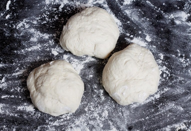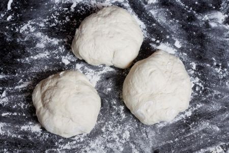 - Nach der Kühlzeit den Teig aus dem Kühlschrank nehmen und in 4–6 gleich große Stücke teilen. Zu Kugeln formen – jede Kugel ergibt eine Pinsa. Die Teigkugeln abgedeckt nochmals 30 Minuten bei Zimmertemperatur ruhen lassen.