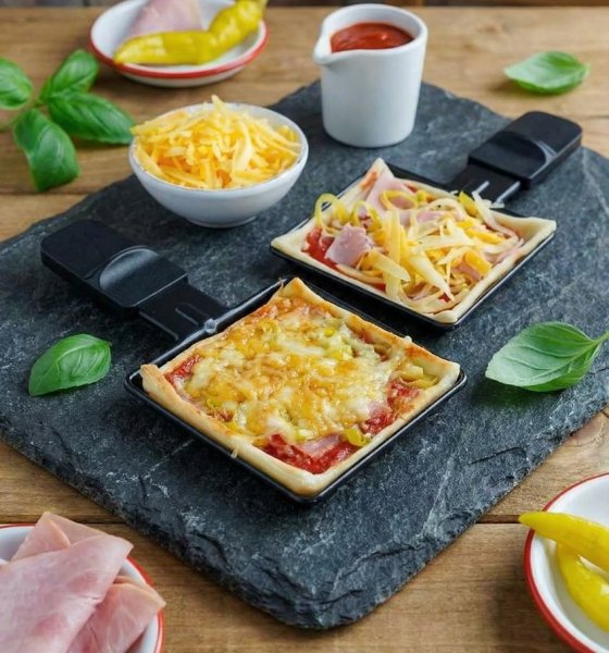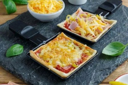 - Je ein Teigstück in ein Raclette-Pfännchen legen und auf der heißen Platte etwa 5 Minuten vorbacken, bis der Teig leicht Farbe annimmt. Anschließend mit Tomatensauce bestreichen und etwas geriebenen Parmesan darüber streuen.