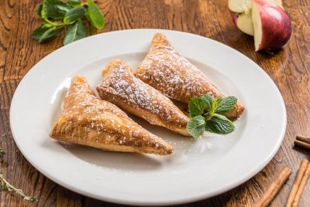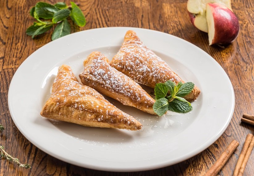 - Den Teig auf einer bemehlten Arbeitsfläche zirka 3 mm dünn ausrollen und in etwa 10×10 cm große Quadrate schneiden. Das Apfelmus mit etwas Zimt verfeinern und jeweils zwei Teelöffel davon mittig auf die Teigstücke setzen. Die Ränder mit verquirltem Ei bestreichen, die Quadrate zu Dreiecken falten und die Kanten – am besten mit einer Gabel – fest zusammendrücken.