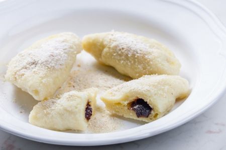 - In einem großen Topf Salzwasser zum Kochen bringen. Währenddessen die Arbeitsfläche gut bemehlen und den Teig zirka 3 mm dünn ausrollen. Dabei regelmäßig Mehl verwenden, damit der Teig nicht am Nudelholz haftet. Mit einem Glas oder Ausstecher (Ø 7–8 cm) Teigkreise ausstechen. In die Mitte jeweils einen kleinen Klecks Powidl setzen. Die Ränder leicht mit kaltem Wasser bestreichen, die Kreise zusammenklappen und die Ränder mit einer Gabel fest andrücken.