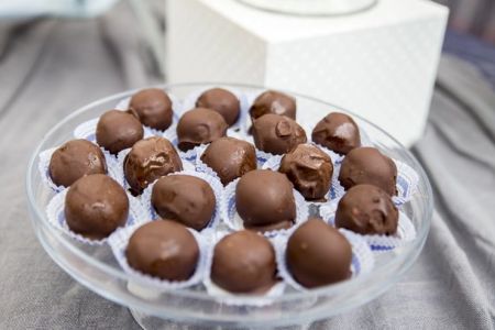 - Den Schokoladenkuchen in zirka 2,5 cm große Stücke schneiden und in eine Schüssel geben. Orangensaft und Marillenmarmelade aufkochen und über die Kuchenstücke gießen. Alles gründlich vermengen, bis eine formbare Masse entsteht. Daraus zirka 3 cm große Kugeln rollen und mindestens 1 Stunde im Kühlschrank kühlen, damit sie fest werden.