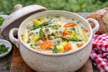 - Kartoffeln, Möhren, Spargel, Champignons sowie die Erbsen in die Sauce geben. Alles etwa 5 Minuten köcheln lassen, damit sich die Aromen verbinden. Mit Salz, Pfeffer und Zitronensaft abschmecken. Das Spargelragout auf Teller anrichten, nach Belieben mit frisch gehackter Petersilie bestreuen und heiß servieren.