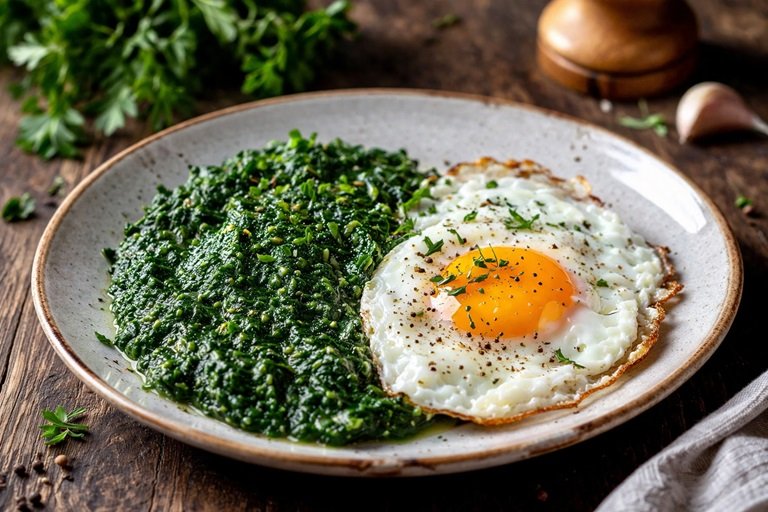 - Die Eier in einer Bratpfanne mit etwas Öl zu Spiegeleiern braten. Den Spinat mit Spiegelei anrichten und genießen.