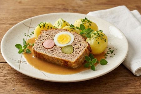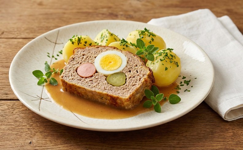 - Den Backofen auf 180 °C Ober-/Unterhitze vorheizen und eine Bratenform leicht einfetten. Das Schweinenetz ausdrücken und flach auslegen. Die Hälfte der Fleischmasse darauf zu einem länglichen Laib formen und mit der Hand drei Mulden eindrücken. In diese Mulden die hartgekochten Eier, Essiggurken und Frankfurter Würstel legen. Die restliche Fleischmasse darüber verteilen, die Seiten gut andrücken und den Braten zu einem kompakten Striezel formen. Das Schweinenetz darüber schlagen und den Stefaniebraten mit der Naht nach unten in eine geölte Bratenform legen.
