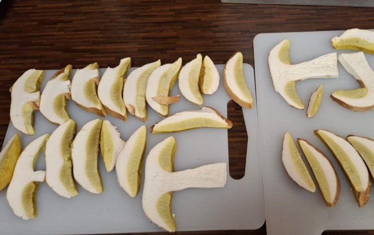 - Für die gebackenen Steinpilze die frischen Pilze vorsichtig putzen, nicht waschen, sondern mit einem Küchenpinsel oder Tuch reinigen. Danach in zirka 0,5 cm dicke Scheiben schneiden und leicht salzen.