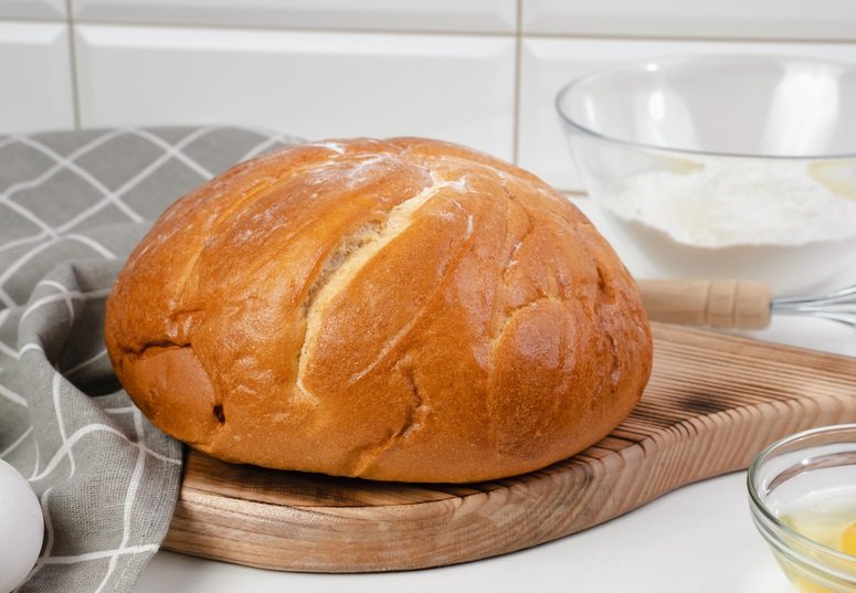 - Den fertigen Brotteig auf eine leicht bemehlte Arbeitsfläche geben, zu einer Kugel formen und auf ein mit Backpapier belegtes Backblech legen. Nochmals etwa 30 Minuten ruhen lassen.