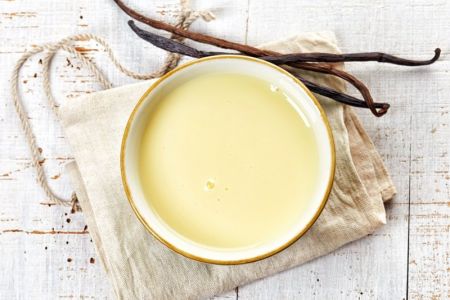 - Nun die vorbereitete Eiercreme zügig unterrühren und so lange schlagen, bis eine glatte, samtige Sauce entsteht. Nicht mehr kochen lassen! Die Vanillesauce kann sofort serviert oder vollständig abgekühlt werden – beim Abkühlen wird sie etwas fester.